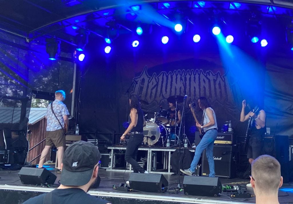 Freitag, der 05. August ein sonniger Tag mit ein paar dunklen Wolken, die bis zum frühen Nachmittag schnell vorbeiziehen und am Abend mit einer Unwetterwarnung aufwartete. Nach unserem ersten Getränk und den Erinnerungen an die "alten Zeiten". Fuhren wir an das Oberbecken. Zack! Eintritt bezahlt, gleich bekannte Gesichter gesehen. Gefreut. Bier gekauft, Gequatscht und die letzten 3 Songs der "The Royal Booze Conspiracy" gehört aus Chemnitz, ich kann nicht allzu viel dazu sagen, nur das der Sound top war und die ein mega langes Guitarrensolo rausgehauen haben. Fein. Fix noch ein Bier geholt (ich musste ja an dem Abend nicht mehr fahren - fettes Danke lieber Musch) und dann hatten wir uns vorgenommen "Deluminator" aus Dresden anzuschauen. Anzuschauen, weil ich mir manchmal einbilde ich bin zu alt dazu rumzuhüpfen, meinen Kopf kreisen zu lassen, zu two-steppen und Kartoffeln zu ernten. War ich doch nicht. Ich habe dann wild meinen Tanzeslüsten nachgegeben. War klasse!